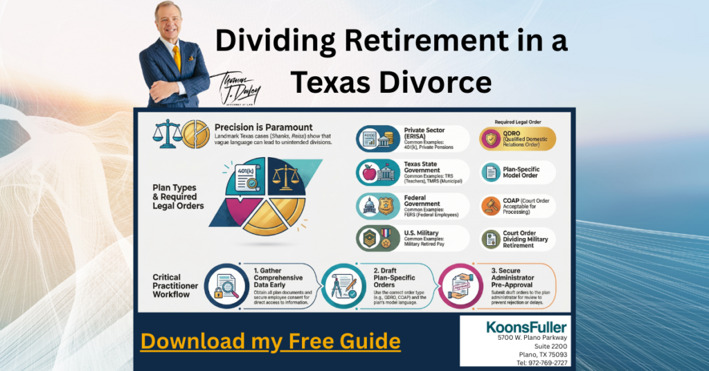 Dividing retirement benefits in a Texas divorce—whether a 401(k), pension, cash-balance plan, or government retirement system—requires precise legal steps, plan-specific orders, and a properly drafted Texas QDRO (Qualified Domestic Relations Order). Unfortunately, this is also one of the most common areas where spouses lose significant value simply because they don’t understand how Texas community-property law applies to retirement assets. If you’re searching for clear guidance on how retirement is divided in divorce, how Texas QDROs work, and how to protect your share of benefits, this comprehensive free guide will walk you through every major step. Written by a board-certified Texas family-law attorney, it covers the rules, the risks, and the strategies that help ensure retirement plans are divided correctly—and that you don’t leave money on the table. Download your free copy below to learn exactly what you need to know before dividing retirement in a Texas divorce.
