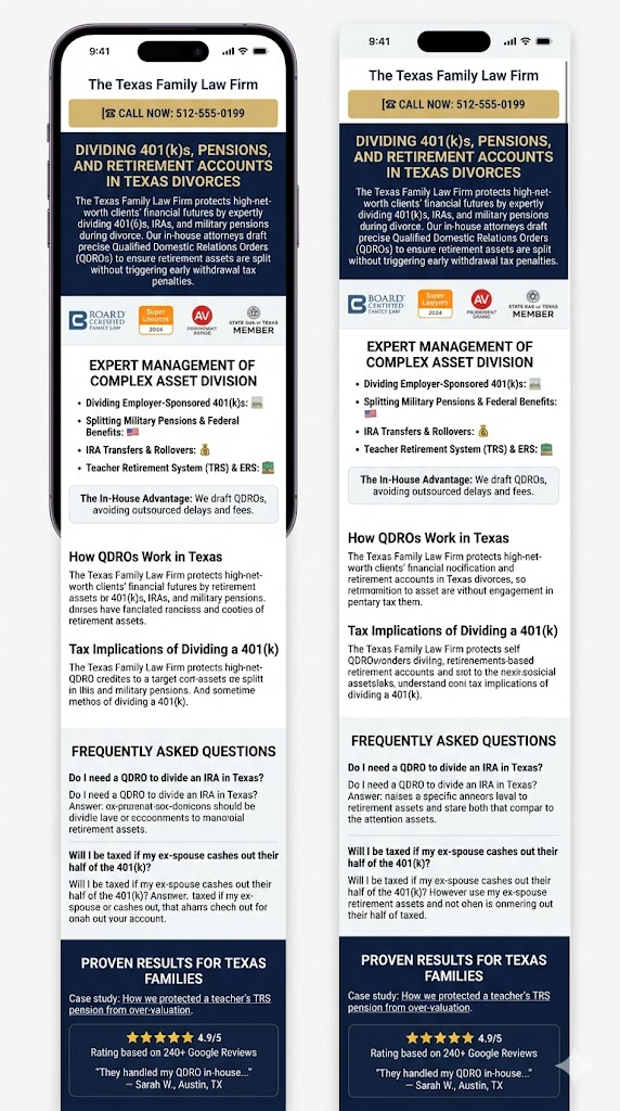 - Targeted H1 Heading: Instead of a generic heading like “Asset Division,” the H1 should explicitly mirror the prospect’s problem, such as “Dividing 401(k)s, Pensions, and Retirement Accounts in Texas Divorces”.